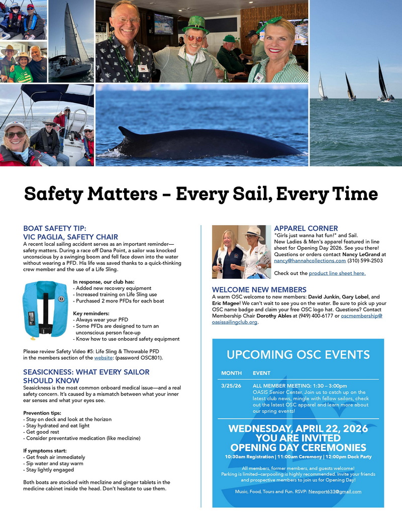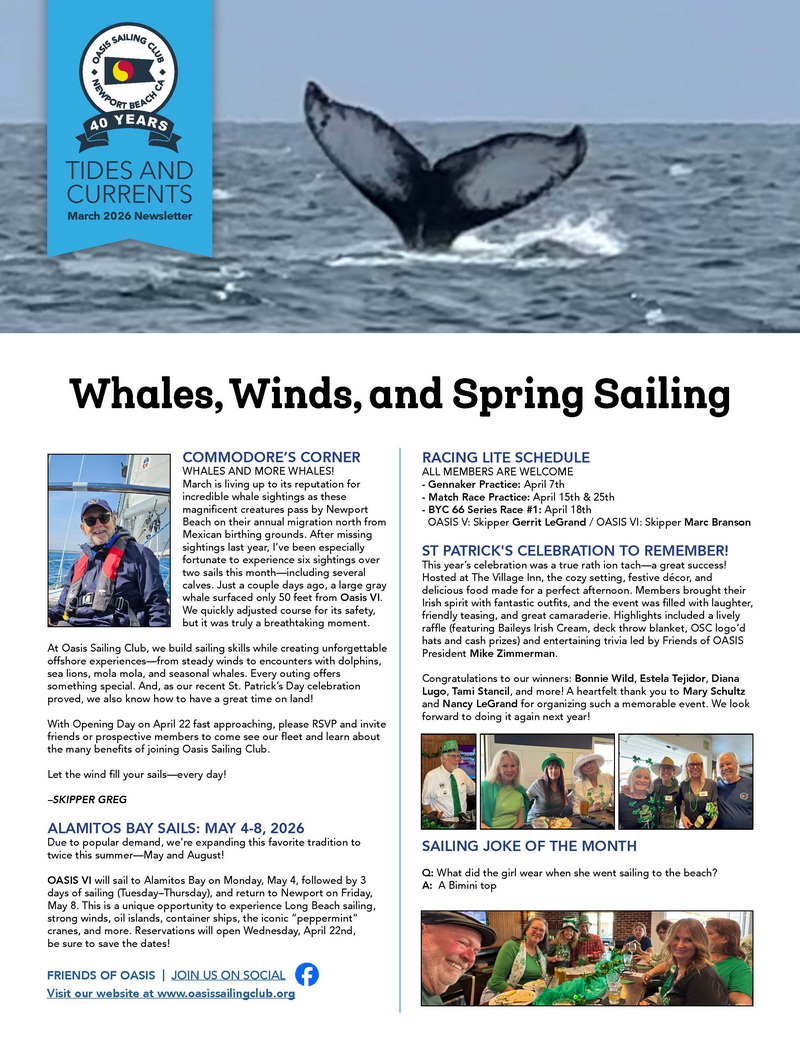OASIS Sailing Club makes recreational sailing available to members and their guests and provides instruction in sailing to those members who wish to learn how to handle a sailboat. Enjoy year-round sailing aboard our beautiful Catalina 34 MKII sloops Oasis V and Oasis VI. Both are in excellent shape and ready for all-weather operations. Sailing is sometimes tranquil, often challenging and always enjoyable. Over 150 friendly club members welcome both experienced and new sailors. The Club meets the last Wednesday of every month, from 1:30-3 pm at the OASIS Senior Center. Dues are $70/month.